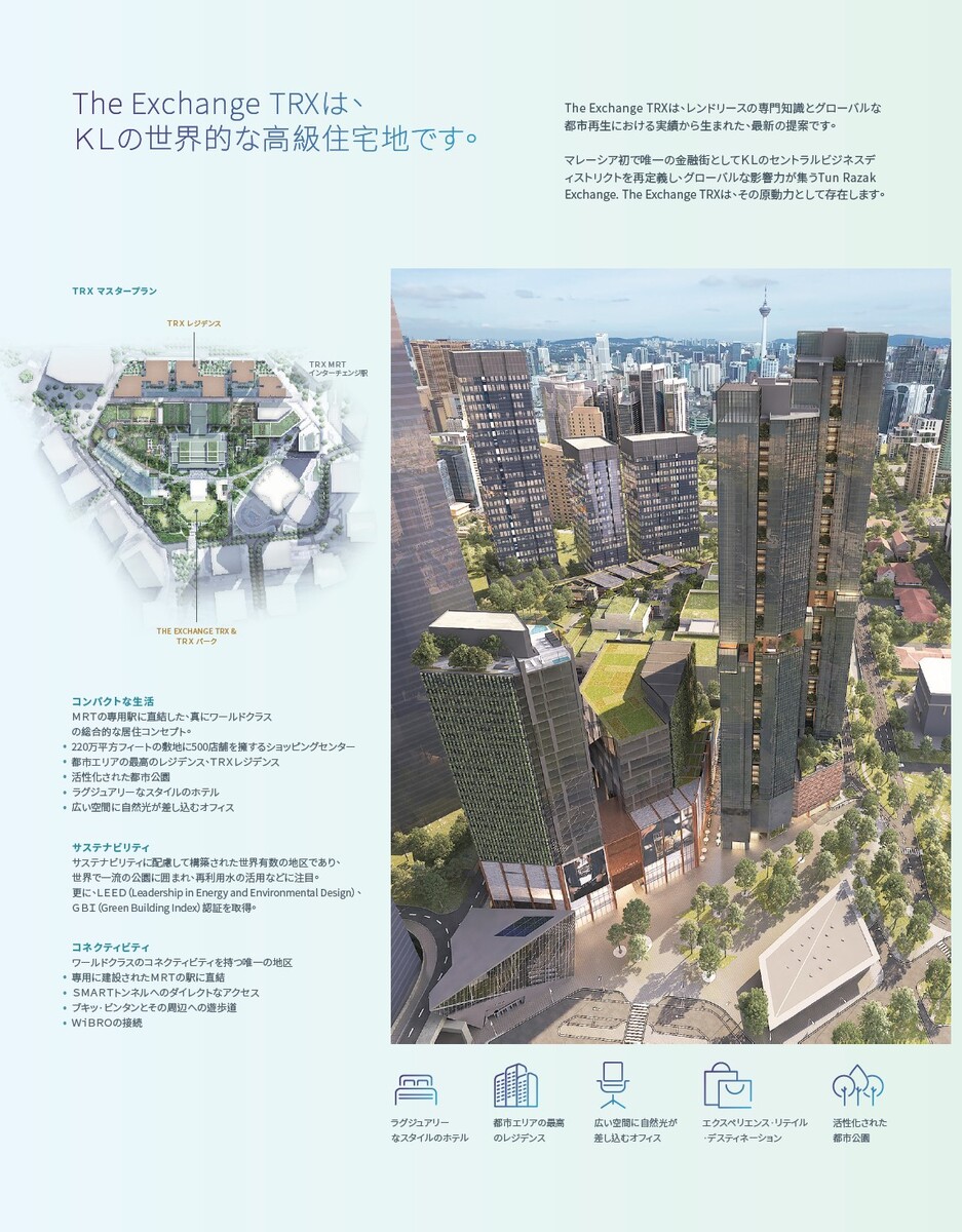 TRX(Tun Razak Exchange) 金融庁と関わり国家プロジェクトで国際金融センター。 クアラルンプール中心部、70エーカーの土地にマレーシアの財務省と関わっている国際金融特区という国家プロジェクトです。 マレーシアクアラルンプール都内にある一番中心であります。 TRXの開発者であるTRX City Sdn Bhdはマレーシア財務省が所有しています。 TRX国際金融センターの中にオフィスビル、ショッピングモール、コンドミニアムがあります。 最先端技術システム及び環境システムを整えております。 ショッピングモールは2021年完成予定。マレーシアで一番高いタワーとなり、Exchange 106もできております。 現在はマレーシアでは開放的で環境に配慮した注目の国際金融特区TRXと一番注目されております。 ブキビンタンやプドゥに隣接するTRX(Tun Razak Exchange)は、マレーシア国家の経済プログラムの一環で国際金融特区として戦略的に開発されているエリアで、70エーカーという広大な敷地は、国際金融特区のため金融系企業への税制の優遇やグローバル企業とローカル企業を結びつけるグローバル金融センターであり、イスラム金融センターとは言えるでしょう。 グローバル企業HSBCやプレデンシャルも立っており、アメリカのインコンチホテルグループであるKimton ホテルも立っております。 商業エリア、住宅エリア、ショップエリアともあり、グローバル金融シティと言われます。 マレーシア一番高いビル建物はThe Exchange 106で、その高さは492.3メートル。クアラルンプールで有名なツインタワーより階層が多く、高く、2019年末から現在マレーシアで31番目の高さを誇るビルになる予定です。 その数年後、PNB118はマレーシア一番高いビルであります。 2022年下期、西武はショッピングモールに出店すると言われております。 106 Exchangeビルのライトアップ セッティングは日本企業より管理されております。ビルセキュリティ管理は日本の日立技術だと言われております。 国際金融特区計画は「The Global Exchange TRX」と呼ばれるマルチ商業施設が設計しております。 グローバルレベル高級ブランド店400~500が集まりファッションや生活雑貨のほか、日本の「デパ地下」のようなグルメを集めたスペースを設けることも予定されてます。レジデンスは、この環境の良さから早くも注目されています。 TRX Residencesといったレジデンスの位置はTRX駅の前にあり、場所バリューなど最高で一番バリュー付きの案件と言えます。 2020年の下期から販売も開始しており、ショールームなど物件見も可能となります。 国際金融特区で先端的な環境優しい住環境が、KLの中心地に最高バリューを誕生することもあり、投資家関係者や移住を検討する日本人にはすごい視線が注がれています。 今後は第三世代経済になる東南アジアにはマレーシアのアジアナンバー1.を目指すイスラム金融センター及び国際金融センター、TRXは、国家プロジェクトとして1期目と2期目も開発しておりますので今後の10年はこの開発プロジェクトはどこまでバリューをつけられるでしょうか。
